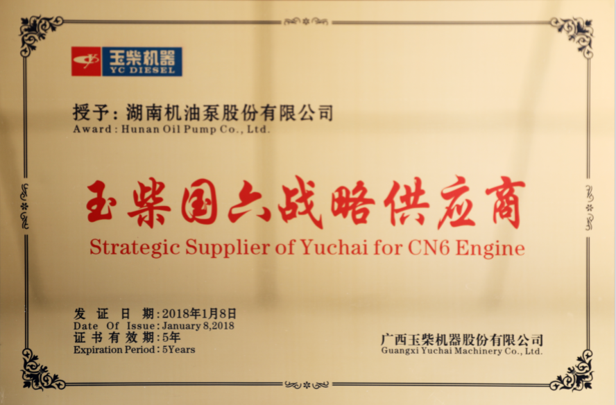 湖南機油泵股份有限公司作為玉柴國六發動機的戰略供應商之一和2017年度優秀供應商,同時也作為中國內燃機工業協會確認的“中國內燃機工業排頭兵企業”。湘油泵隨著玉柴機器的發展做大做強,在技術上不斷創新,每年設計開發新產品達100多種,申請國家專利、發明專利授權200多項,建立了國內一流的試驗中心、國家認定企業技術中心,二十多項科研成果、新產品獲得國家、省、市科技進步獎。
